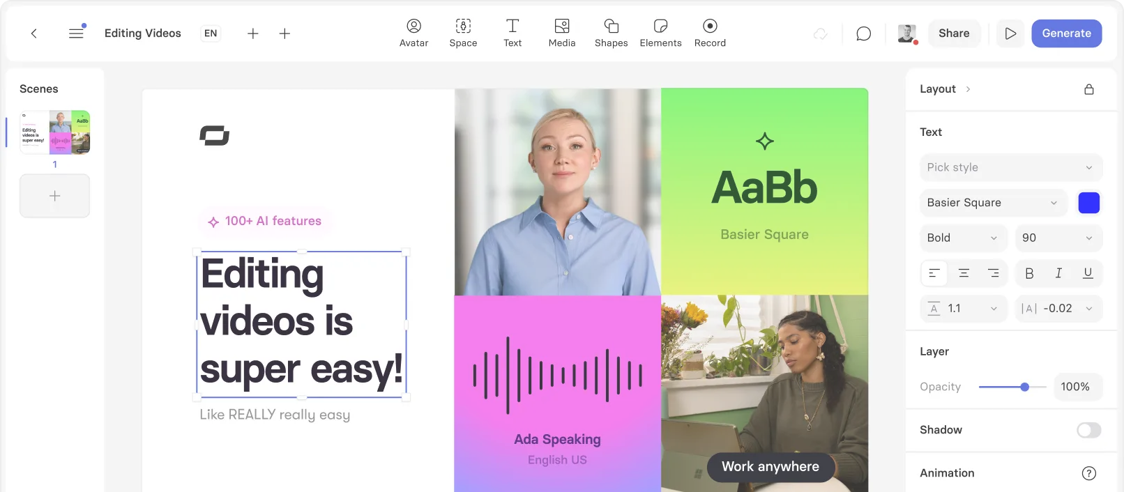 • Edit Videos: Use pre-designed templates and AI assistance to transform documents, PDFs, website links or ideas into polished videos.